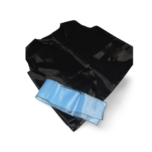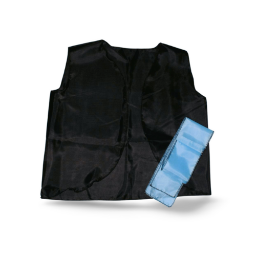 Incluye chaleco negro y faja celeste, confeccionados en tela satinada liviana y cómoda.