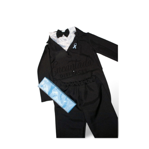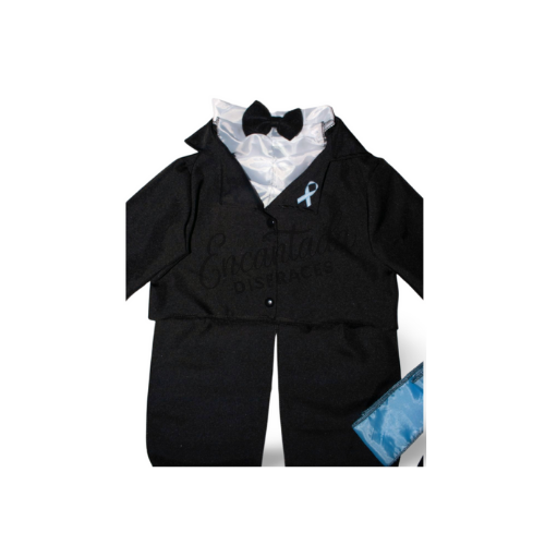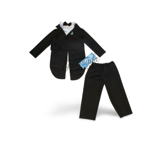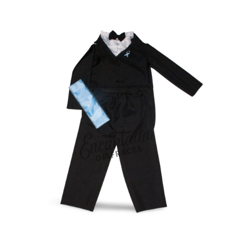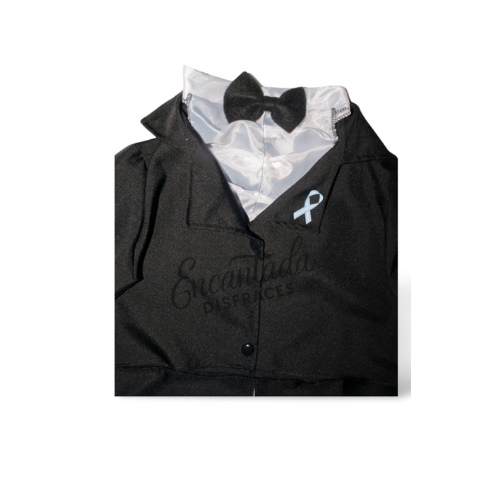 Incluye saco negro con solapas, camisa con moño y pantalón a juego, confeccionados en tela suave y cómoda.