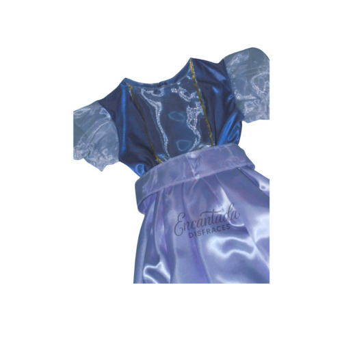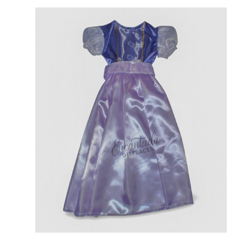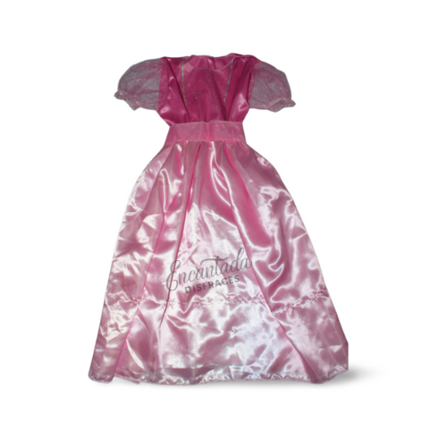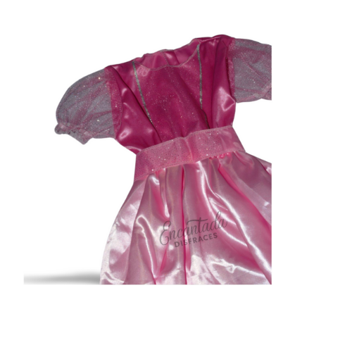 Confeccionado en satén brillante color rosa o lila, con mangas abullonadas de tul con brillo y falda amplia para un toque mágico.