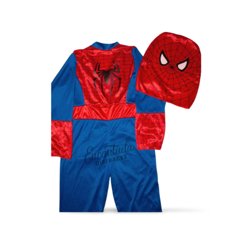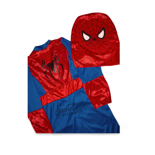 El conjunto está confeccionado en tela suave y brillante en los clásicos colores rojo y azul, con el emblemático símbolo de la araña en el pecho.
