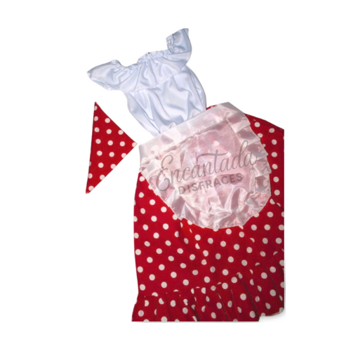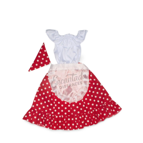 Incluye blusa blanca con hombros descubiertos, falda roja con lunares blancos, delantal satinado y pañuelo para la cabeza, confeccionados en tela suave y cómoda.