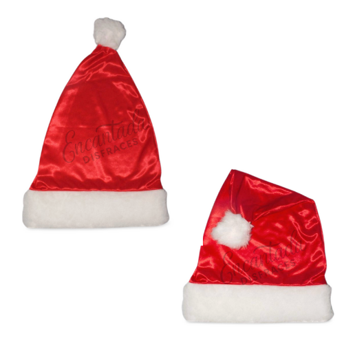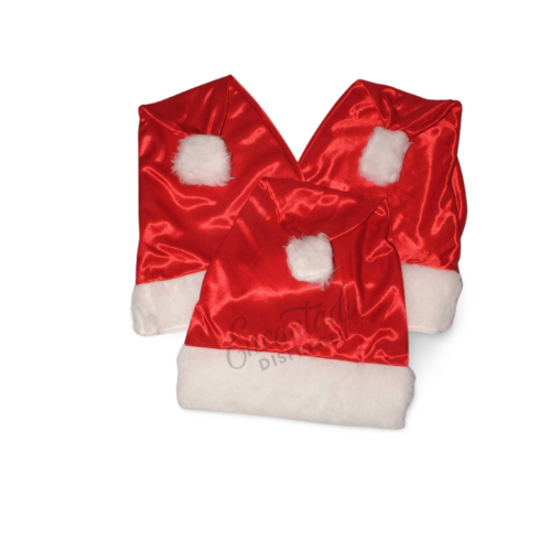 Incluye 3 gorros confeccionados en tela satinada roja con borde de piel sintética blanca y pompón suave.