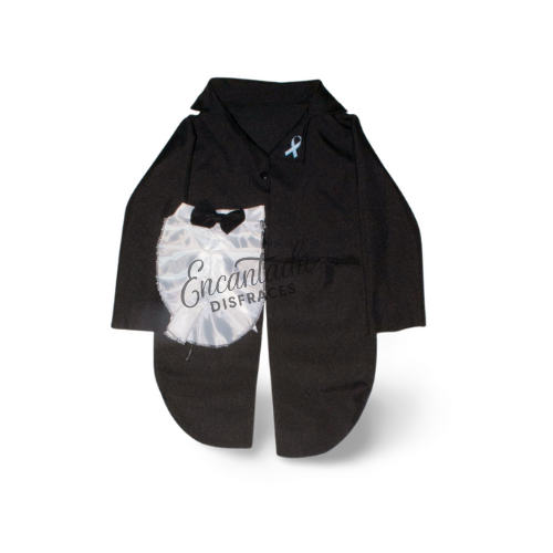 Incluye saco negro con solapas, moño y pechera satinada blanca, confeccionados en tela suave y cómoda.