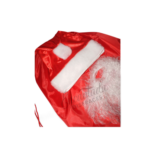 Incluye gorro clásico rojo con borde blanco, bolsa navideña y barba blanca esponjosa, todo confeccionado en tela satinada brillante.
